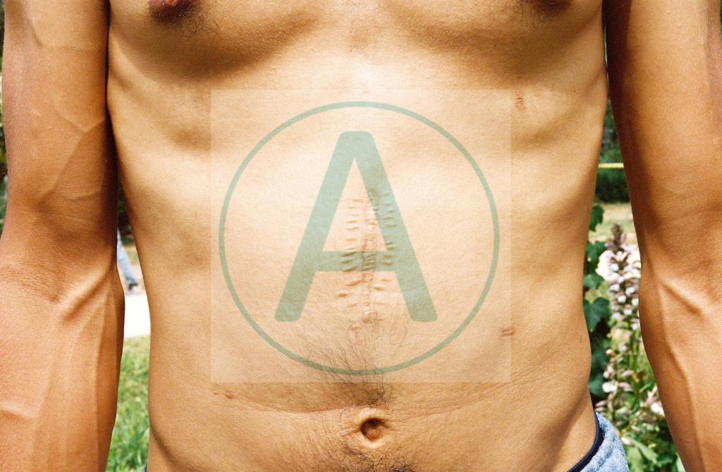 The composition emphasizes the contrast between vulnerability and resilience: the bare torso exposed to summer light situates the subject within a natural, unguarded moment, while the scar interrupts the smooth continuity of skin with a textured record of past suffering.